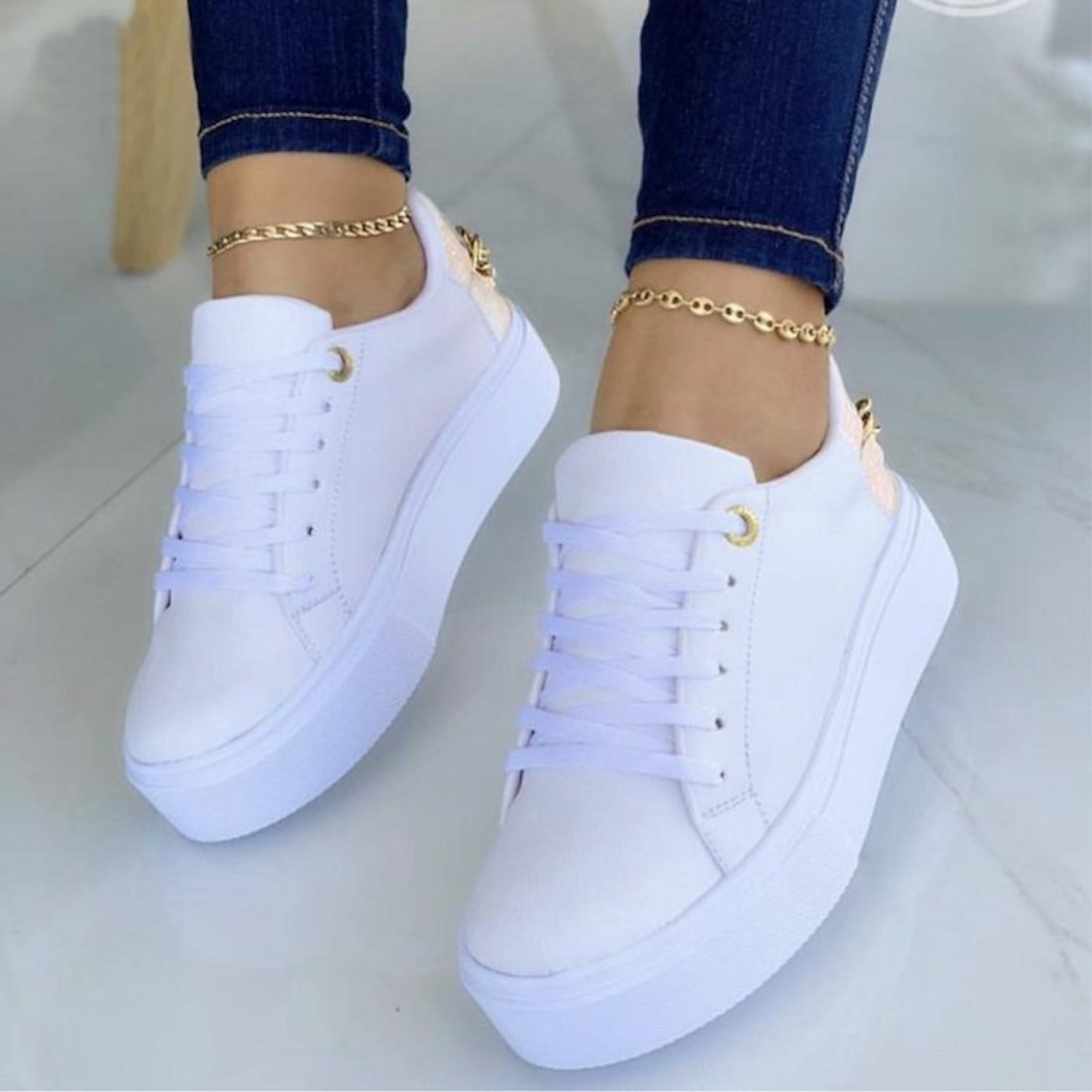 Women's White Platform Sneakers with Gold Accents – Comfortable Lace-Up Casual Shoes for Everyday Wear 2025